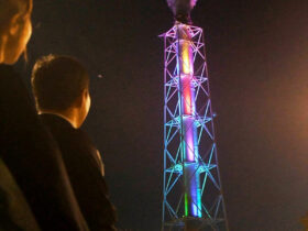 感謝届けと煙突輝く 福島県新地町の相馬共同火力発電新地発電所 営業運転30周年でライトアップ
