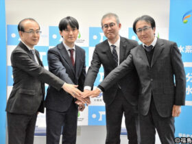 粉体水素の製造・開発に向けて決意する李社長(左から2人目)。左は吉田町長 2026/01/27 11:36 水素燃料電池ドローンなどを手がける福島県大熊町の「OKUMA TECH(オ… -