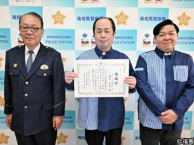 感謝状贈呈に臨んだ(左から)伊藤署長、野中店長、霜山オーナー 2025/11/27 17:30 成り済まし詐欺の被害を未然に防いだとして福島県南相馬市小高区のローソン南相馬小高店の野… -