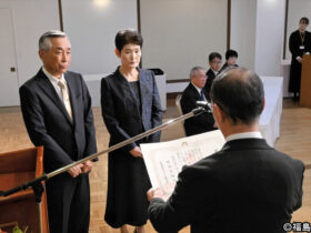 しあわせ金婚夫婦表彰を受ける志賀さん夫婦 2025/11/25 13:56 福島県の南相馬市金婚祝賀会は21日、市内原町区のラフィーヌで開かれた。福島民報社と県老人クラブ連合会の「し… -