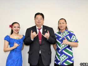 左からレヒヴァ由妃さん、関根社長、ジンLEONさん 2026/01/08 10:01 福島県いわき市のスパリゾートハワイアンズは創業60周年となる15日、節目を記念し… -