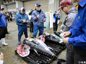 威勢の良い掛け声が響いた初競り 2026/01/06 15:43 福島県いわき市中央卸売市場の初市式と初競りは5日、市内鹿島町の同市場で行われ、鐘の音を合図に威勢の良いかけ声が響き渡… -