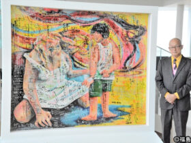 自身が描いた油絵を披露する伊藤さん。震災と原発事故で被災した県民の声が記されている 2025/10/05 10:32 名古屋市在住の画家伊藤崇人さん(72)が東日本大震災と東京電力福… -