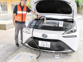 水素燃料電池車で給電実証実験 福島県いわき市 福祉避難所で活用想定 エアコン12機で8時間稼働可能