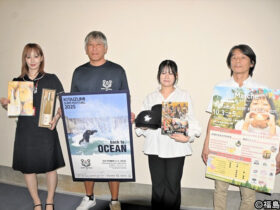 イベントをPRする室原委員長(左から2人目)と栗村委員長(右端)ら 2025/09/30 15:19 復興支援サーフィンイベント「KITAIZUMI SURF FESTIVAL 20… -