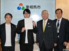 門馬市長(右から2人目)から委嘱状を受けた朝野さん(左から2人目) 2025/11/11 14:59 福島県南相馬市の起業型地域おこし協力隊に、大阪府出身の朝野建大さん(31)が着任… -