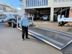 ジャパンモビリティショーに出展したセフティーローダと能條会長 2025/11/11 15:07 福島県いわき市好間工業団地の花見台自動車(能條幹也社長)は、9日まで東京ビッグサイト(… -
