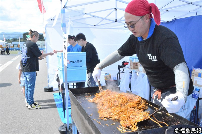 地元のなみえ焼そばのほか、青森県の黒石つゆやきそば、秋田県の男[お]鹿[が]しょっつる焼きそば、宮城県の石巻焼きそばと仙台マーボーやきそばの「東北やきそば」を販売している。静岡県の富士宮やきそばがゲスト出店している。各ブースに長蛇の列ができた。