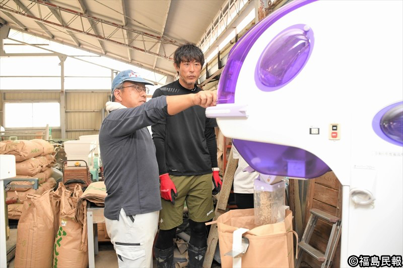 浪江町でコメ作りに携わり、もみすり作業に取り組む山本さん(右)。左は佐藤さん