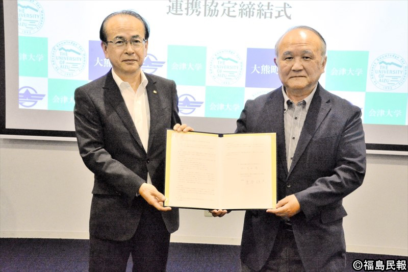 町役場本庁舎で協定締結式が行われ、吉田淳町長と束原恒夫理事長兼学長が協定書を交わした。吉田町長は原発事故による町民の避難先となった会津若松市に小中学校の仮校舎を置いた際、会津大から受けた支援に感謝を述べた。「縁が深い会津大と協定が結べてうれしく思う。教育環境創出や、町内企業の振興など町の発展に大きく寄与する」と期待した。