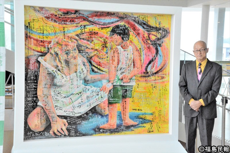 名古屋市在住の画家伊藤崇人さん(72)が東日本大震災と東京電力福島第1原発事故発生直後に描いた油絵が4日、福島県双葉町の東日本大震災・原子力災害伝承館で披露された。震災で被災した千人以上の県民のメッセージが絵の上に記されている。伝承館が館内に常設展示し、複合災害の記憶と教訓の継承に役立てる。