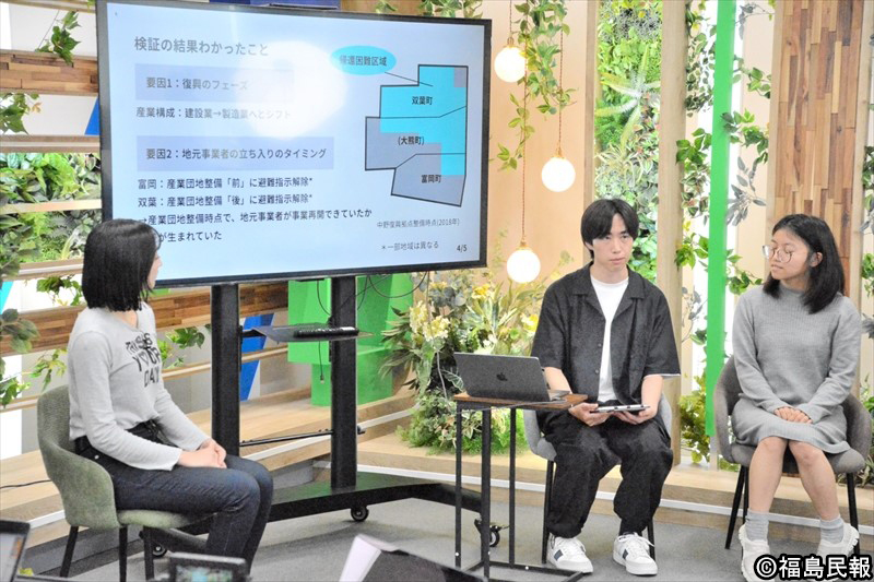 産業をテーマにしたグループは、富岡、双葉両町の産業団地や産業拠点の現状を紹介。立地する企業の業種の違いを分析し、地域の未来像を考えた。