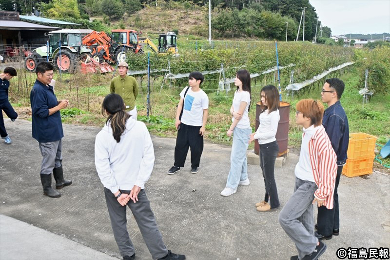 9月に活動がスタートし、2度目の訪問となった。初回は広野町などを訪れてバナナの葉を用いたコースターの製作に取り組んだ。今回は、東京から来た8人がブドウのつるの利活用について考えた。ワイン用ブドウの栽培やワイン製造を手がける南相馬市小高区のコヤギファームを訪れ、三本松貴志代表から同社の取り組みや地域の特徴などの説明を受けた。参加者は積極的に質問し、浜通りのなりわいや暮らしに理解を深めていた。