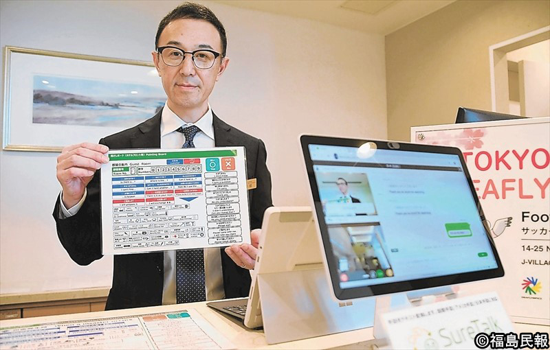 Jヴィレッジは耳が聞こえづらい人々と円滑にやりとりしようと、コミュニケーション用の指さしボードやタブレットをフロントに準備した。フロント担当の木幡博之さん(55)は「選手がピッチで力を発揮できるように全力でサポートする」と話す。