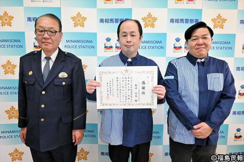 贈呈式は南相馬署で行われた。伊藤英幸署長が野中さんに感謝状を手渡し「不審に気付き、声をかける勇気という二つの『気』が被害を食い止めた」とたたえた。