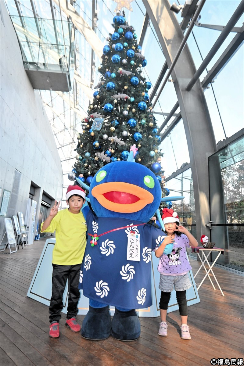 今月の開催日は6、7、24、25日。「ハッピーホリデー!冬は楽シーラカンス」の一環。館内に登場した「ごんべえ」が、シーラカンスの飾りが付いたクリスマスツリーの前で来館者を出迎える。子どもたちがサンタクロースの帽子を着用して一緒に写真撮影をするなど楽しんでいる。