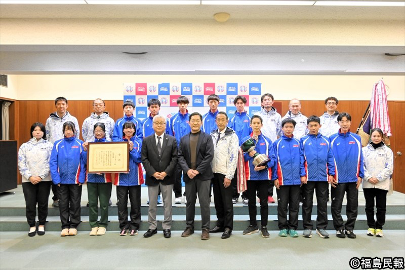 選手ら20人が訪れた。水谷大団長が「3秒差で優勝を逃した昨年の悔しさをばねに、5時間を切る大会新記録をたたきだす活躍をしてくれた」と選手をねぎらった。小野剛監督は「いわきの底力を見せることができた」と述べた。