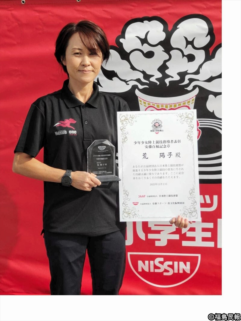 福島県相馬市のランニングチーム「Nexus one」監督の荒陽子さん(48)が、安藤スポーツ・食文化振興財団の安藤百福記念章を受けた。