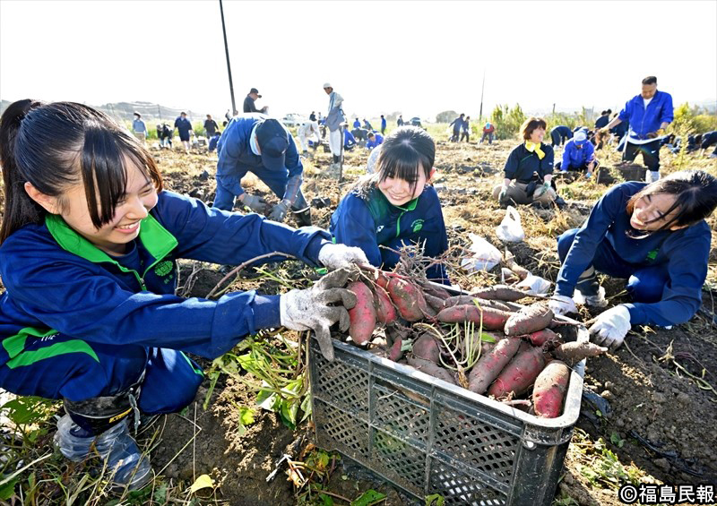 収穫には、ふたば未来学園、磐城桜が丘、平商、小名浜海星の四つの高校や関係各所から約150人が参加した。サツマイモは熟成期間を経て、各校で開発する6次化商品に使う。来年1月にも販売する予定。