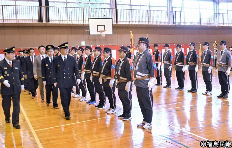 村消防団員と村婦人消防隊員計約70人が臨んだ。遠藤和之団長が「消防人としての責任を自覚し、地域の安全確保へ尽力していこう」と呼びかけた。規律や服装を確認する通常点検を行った後、遠藤雄幸村長が「日ごろの活動の成果が発揮されており頼もしい。共に住民の生命財産を守りたい」と講評・訓示した。