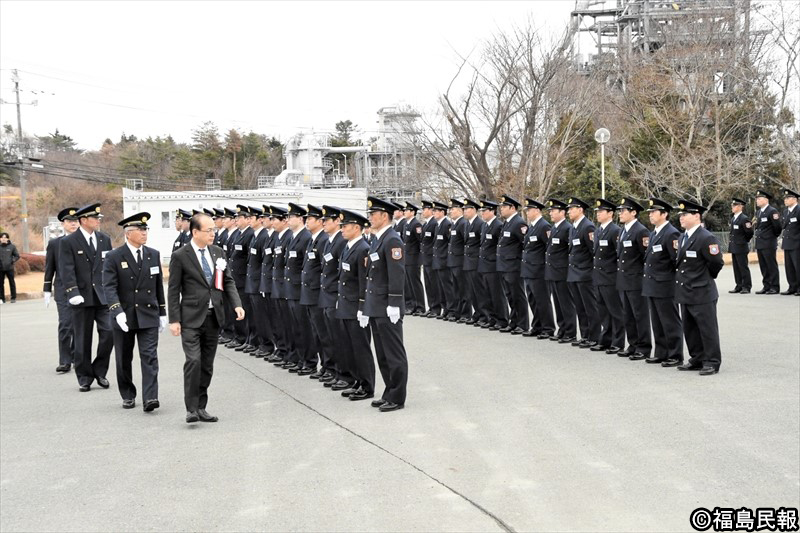 双葉地方広域消防本部の出初式は7日、福島県楢葉町の富岡消防署楢葉分署で行われた。消防署員らが地域の安全安心を守る決意を新たにした。
