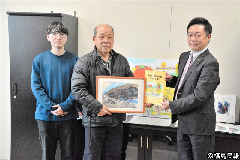 大熊町ではJR大野駅や原発事故により閉店した駅前商店街、中間貯蔵施設敷地内にある旧県水産種苗研究所などを記録。描き残した6枚の絵を一冊の冊子にまとめた。計500冊を制作。14日は活動を共にした関西学院大法学部4年の熊谷朋也さん(22)とともに町役場本庁舎を訪れ、吉岡健太郎副町長に冊子や原画を手渡した。