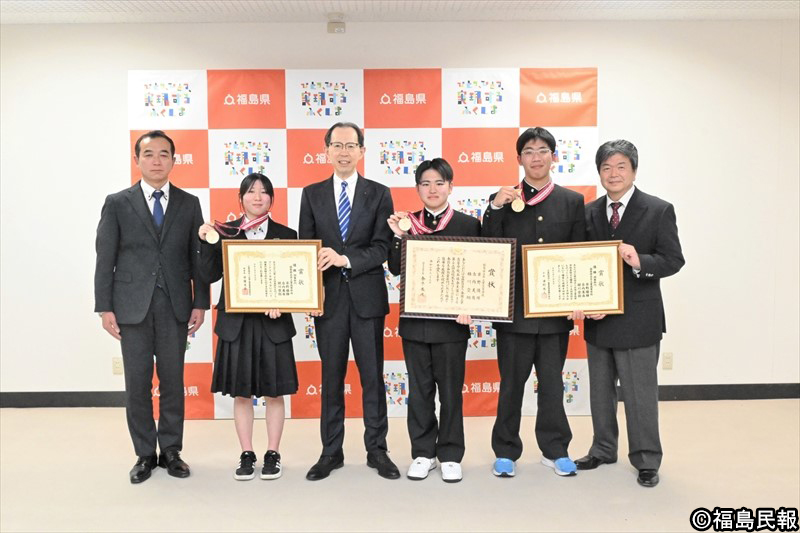 高校生ものづくりコンテスト全国大会測量部門で福島県勢初の優勝を果たした平工高の緑川空翔さん、古内美南さん、草野優輝さん(いずれも土木環境工学科3年)は4日、内堀雅雄知事に表敬訪問を行った。