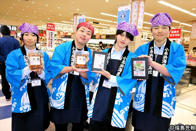 福島県いわき市や茨城県でスーパーマーケットを展開するマルトは、同市の小名浜海星高の生徒、食品製造販売業「小泉食品」と2種類の加工品を共同開発し、店頭での販売を始めた。14日、同校生徒がマルトのSC君ケ塚店とSC城東店で実習販売を繰り広げた。