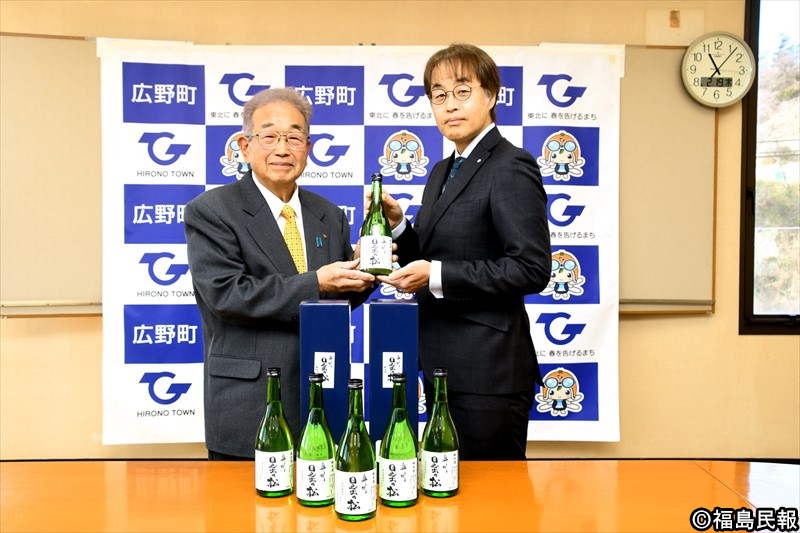 福島県広野町産の特別栽培米コシヒカリを使った純米酒「奥州日之出の松」の新酒が完成した。19日、「広野町の地酒をつくる会」の鈴木正範代表が町役場を訪れ、小松和真町長に完成を報告した。